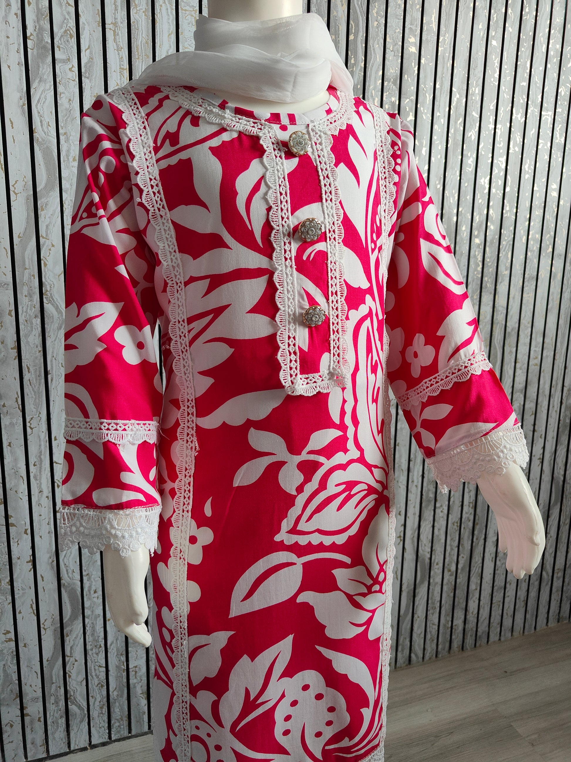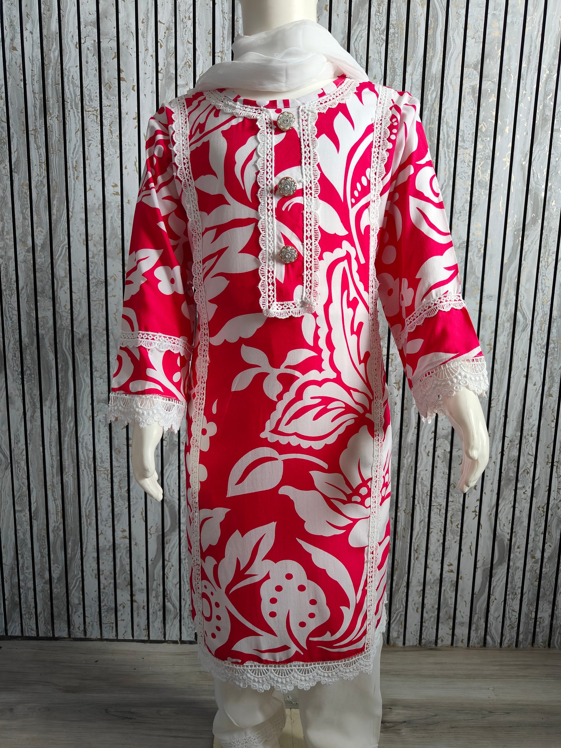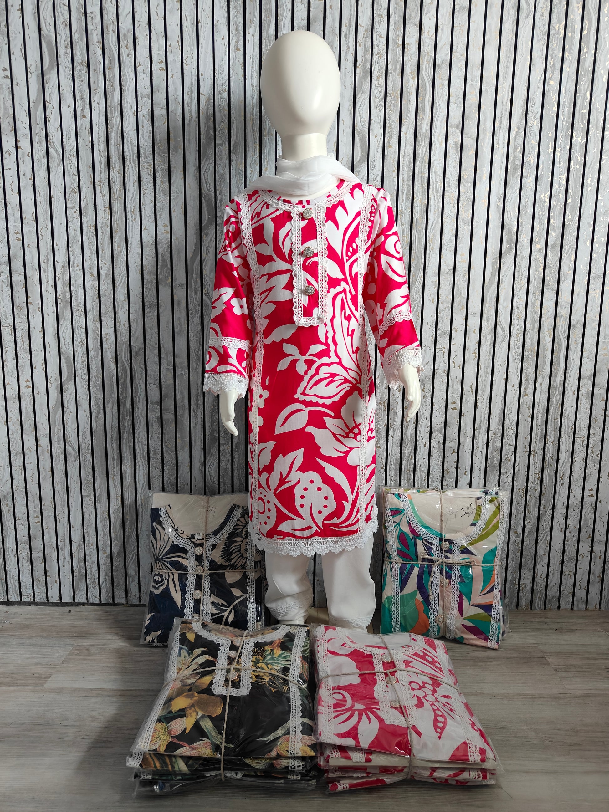 Discover timeless elegance with this Girls Lace Work Dress Set with Dupatta, expertly crafted for style and comfort, now available online for girls aged 4 to 13 years in sizes 24 to 34. Featuring intricate lace detailing along the neckline, sleeves, and borders, this set blends traditional charm with contemporary flair, making it a perfect festive outfit for any occasion. The soft, breathable fabric ensures all-day comfort, while the coordinated dupatta adds a beautiful, elegant touch to your child’s ensemble.