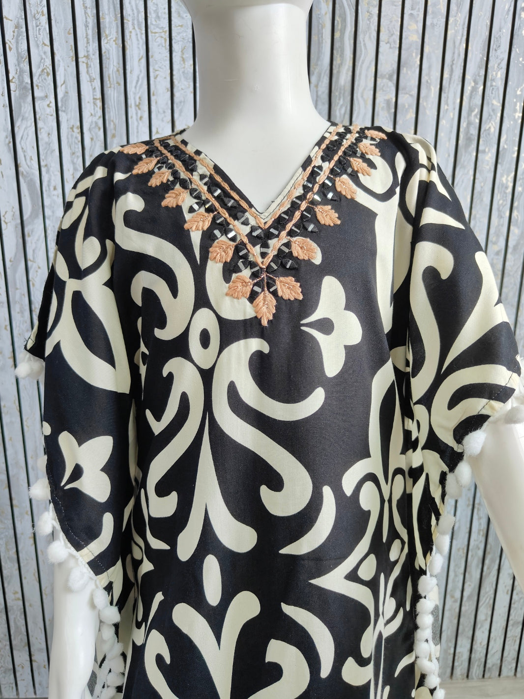 The vibrant red leaf print design gives it a fresh and fashionable appeal, while the pom-pom lace detailing along the edges adds a fun and playful vibe. The kaftan-style top with V-neck embroidery paired with comfortable bottoms makes it a complete co-ord set that blends tradition with modern chic.