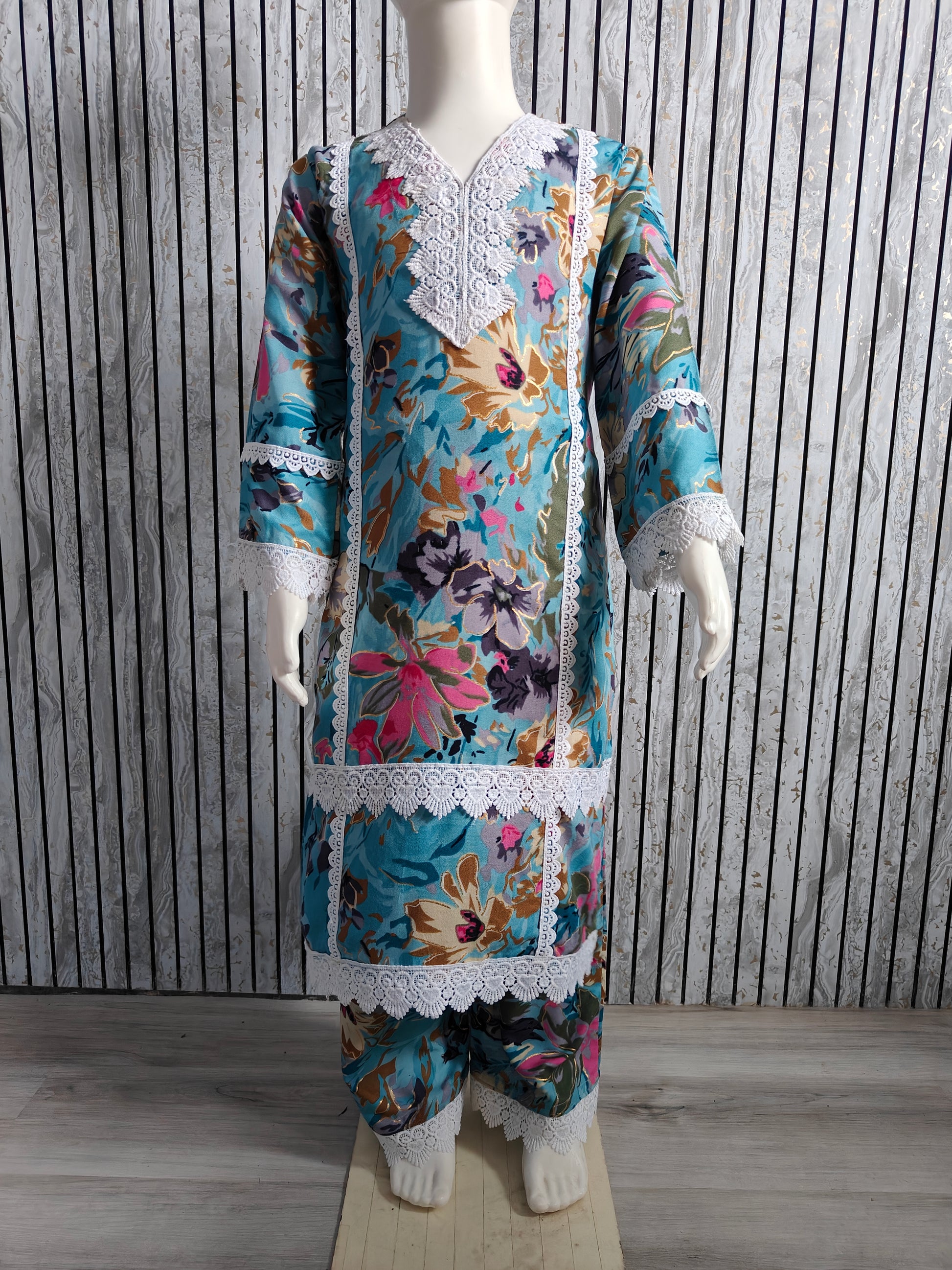 Girls' Floral Turquoise Blue with White Lace Work Co-Ord Set (Age 4-13, Size 24-34)